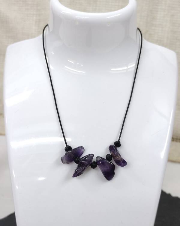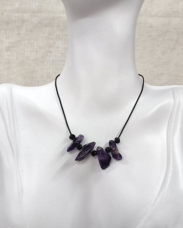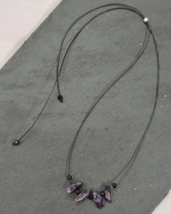 Χειροποίητο κολίε με πέτρες αμέθυστος και χάντρες μάυρες, περασμένες σε κορδόνι δερματίνη, το κούμπωμα αυξομείωνεται. Η διάσταση του είναι 38 εκ. Θα το παραλάβετε σε συσκευασία δώρου.