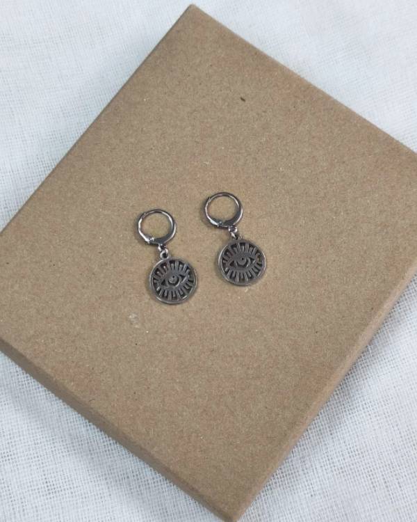 Χειροποιήτα σκουλαρίκια κρεμαστά με κρικάκι ατσάλινο, με στοιχείο μάτι. Το μάκρος του είναι 3 εκ και το στοιχείο είναι 1,5 Χ 1,5 ΕΚ. Θα το παραλάβετε σε συσκευασία δώρου.