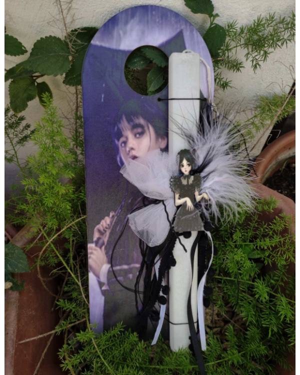 Χειροποιήτη λαμπάδα λευκη ξυστή, με στοιχειο Wednesday , φτερά, τουλι και κορδέλες. Με διάσταση 30 εκ. Σας έρχεται σε συσκευασία λαμπάδας.