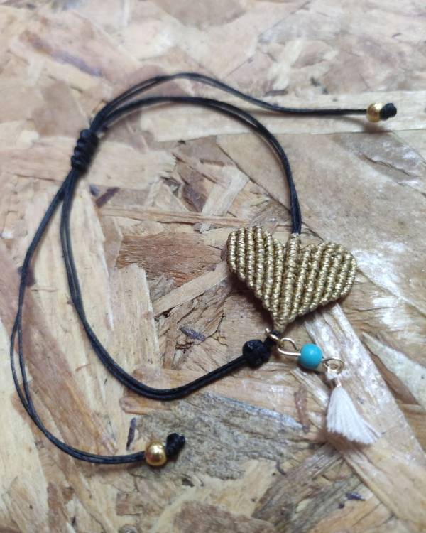Χειροποιήτο βραχίολι μακραμέ μαρτάκι με καρδία χρυσή, για να το χαρίσετε στον εαυτό σας ή σε ένα αγαπημένο σας πρόσωπο. Πλεγμένο με κηροκλωστή χρυση και δύο κορδόνια μάυρα. Με κούμπωμα αυξομείωσης. Το σχέδιο έχει διάσταση 2,5 Χ 2,5 εκ.