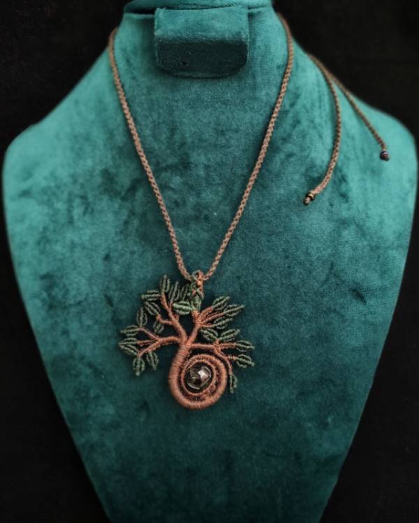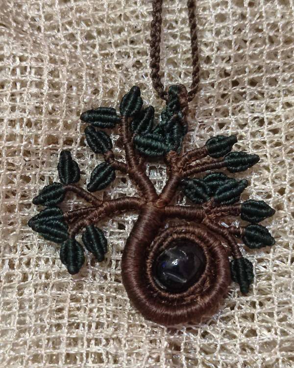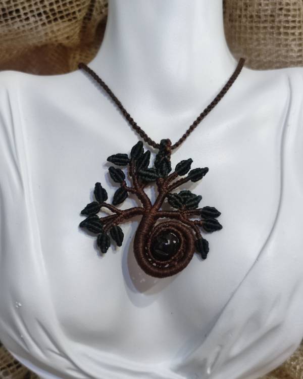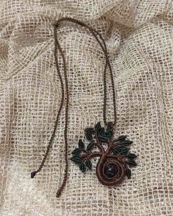 Χειροποιήτο μακραμέ κολίε δέντρο. Ο κορμός είναι πλεγμένος με κηροκλωστή σε καφέ χρώμα, τα φύλλα είναι με κηροκλωστή πράσινη και με χάντρα καφέ. Η διάσταση του είναι 6 Χ 6 εκ. Το κορδόνι του είναι πλεγμένο με κηροκλωστή καφέ, με μάκρος 36 εκ.