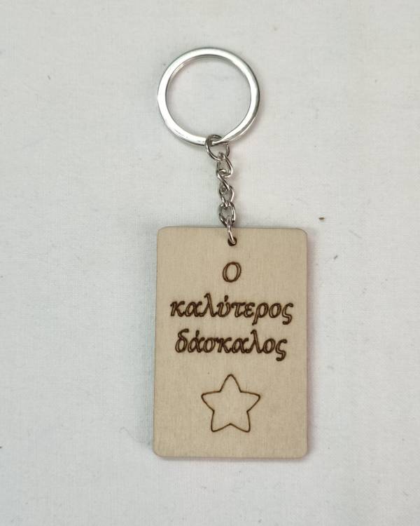 Μπρελόκ ξύλινο σε σχήμα παραλληλόγραμμο. Δωράκι για τον δάσκαλο. Με κρίκο, με αλυσιδάκι, σε ασημί. Η διάσταση του είναι 6 Χ 4 εκ και το ύψος του μαζί με το κρικάκι είναι 11 εκ. Θα το παραλάβετε σε συσκευασία δώρου.