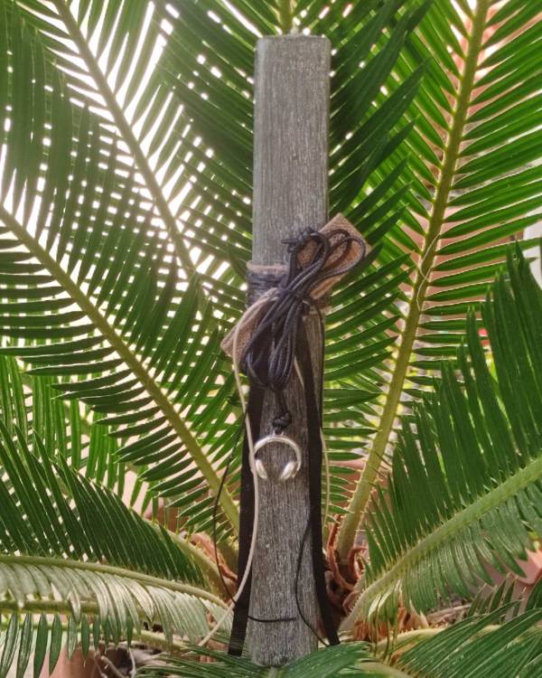 Χειροποιήτη λαμπάδα πλακέ ξυστή πράσινο σκούρο, με κολίε , με στοιχείο μεταλλικο ακουστίκα περασμένο σε κορδόνι δερματίνη και με κορδέλες. Το ύψος της λαμπάδας είναι 25 εκ. Σας έρχεται σε συσκέυασια λαμπάδας.