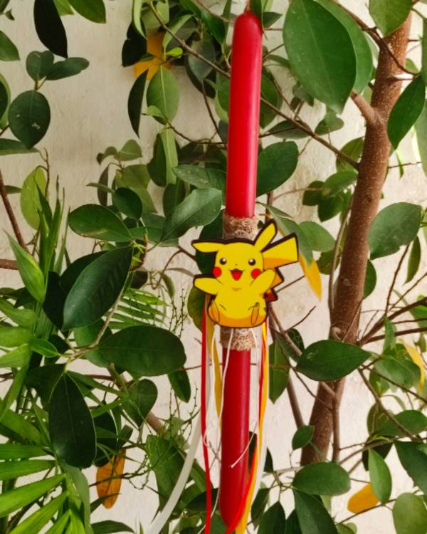 Χειροποιήτη λαμπάδα κόκκινη, με στοιχείο ξύλινο Πικατσού και με κορδόνια. Το ύψος της λαμπάδας είναι 39 εκ. Σας έρχεται σε συσκέυασια λαμπάδας.