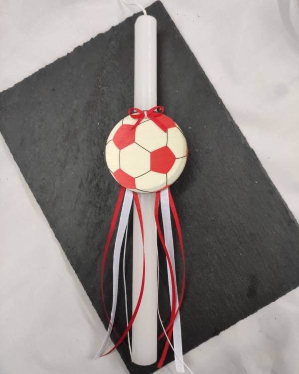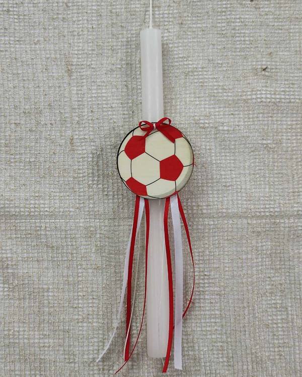Χειροποιήτη λαμπάδα λευκή, με ξύλινο στοιχείο ΟΛΥΜΠΙΑΚΟΣ.  Η δίασταση της λαμπάδας 30 Χ 2 εκ και το στοιχείο 7 Χ 7 εκ .Θα την παραλάβετε σε συσκευασία δώρου.