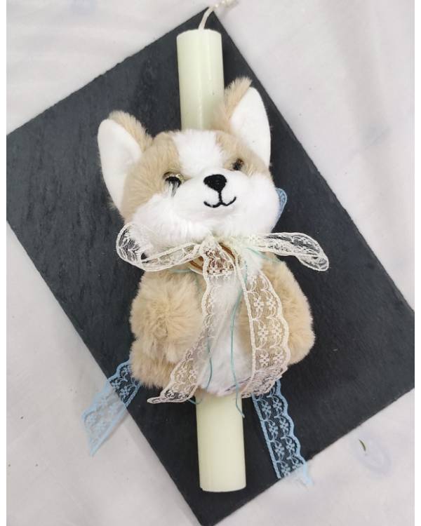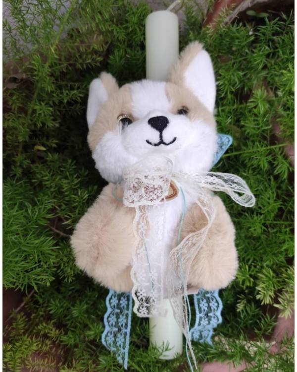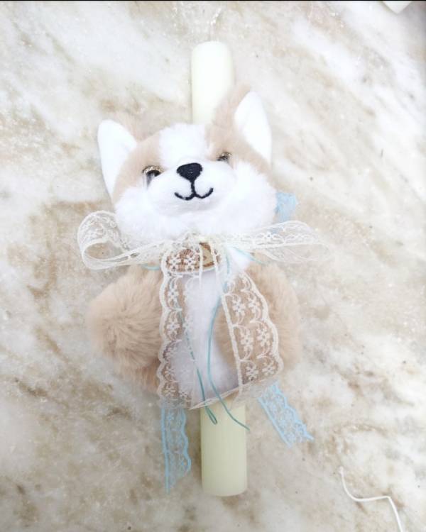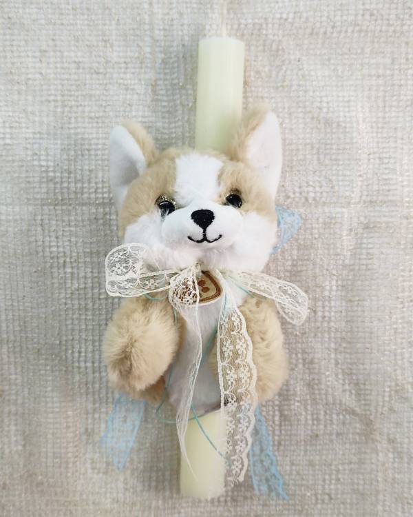 Χειροποιήτη λαμπάδα λευκή στρογγυλή, με ενα λούτρινο σκυλάκι σε καφέ ανοιχτό με λευκό. Η δίασταση της είναι λαμπάδα 30 Χ 3 και το σχέδιο είναι 20 Χ 13 εκ. Θα την παραλάβετε σε συσκευασία δώρου.