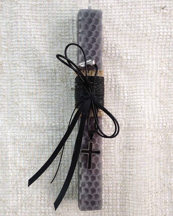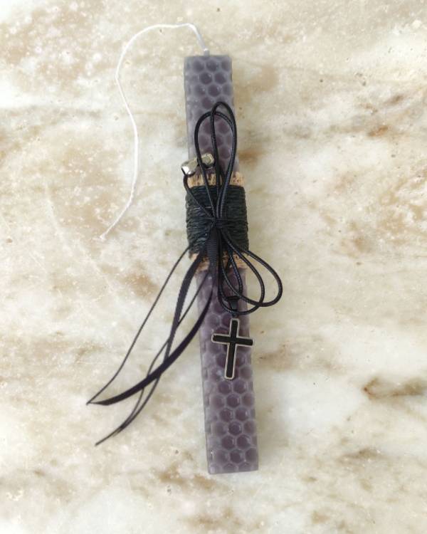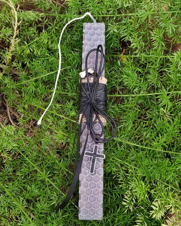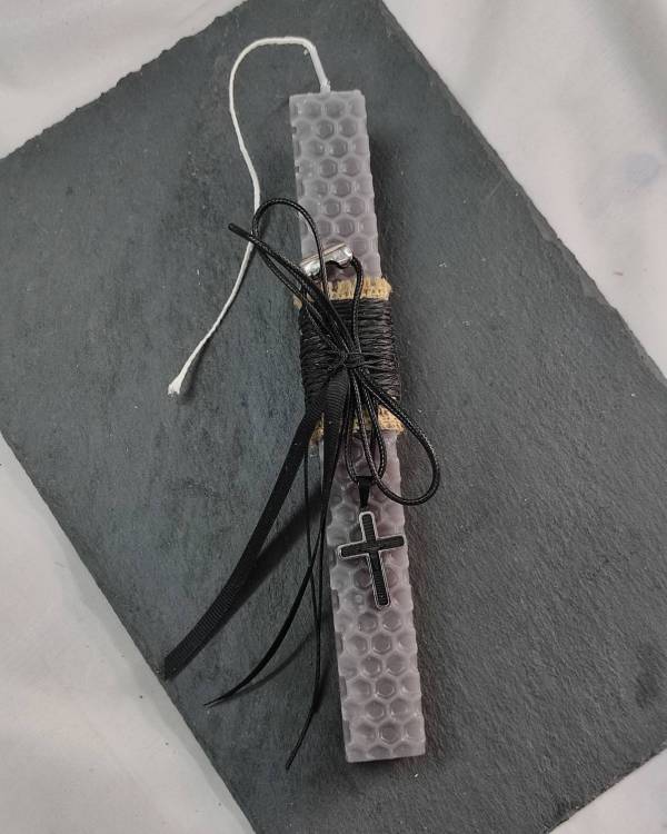 Χειροποιήτη λαμπάδα γκρί τετράγωνη, με κολίε ατσάλινο σταυρό. Η δίασταση της λαμπάδας 21 Χ 2 εκ, ο σταυρός είναι 3 Χ 2 εκ και όλο μαζί είναι 13,5 εκ. Θα την παραλάβετε σε συσκευασία δώρου.