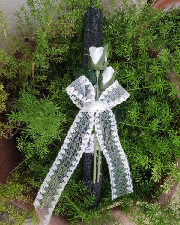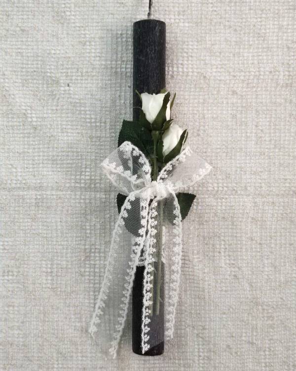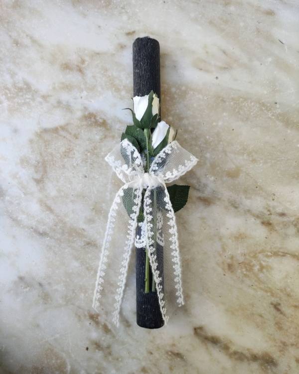 Χειροποιήτη λαμπάδα μαύρη, με τριαντάφυλλα. Η δίασταση της λαμπάδας 30 Χ 3 εκ και το σχέδιο είναι 20 Χ 9 εκ. Θα την παραλάβετε σε συσκευασία δώρου.