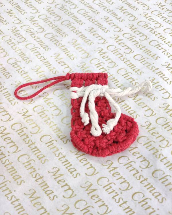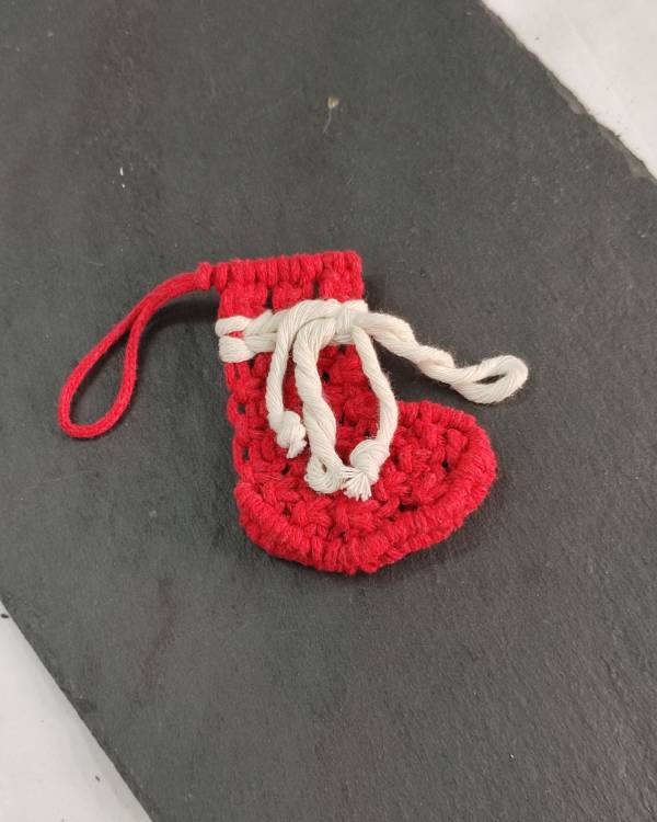 Χριστουγεννίατικο στολίδι μακραμέ μπότα κόκκινη. Η δίασταση της είναι 8 Χ 6 εκ και μαζί με το κορδόνι είναι 14 εκ. Θα την παραλάβετε σε συσκευασία δώρου.
