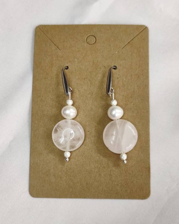 Σκουλαρίκια με ημοπολύτιμες πέτρες λευκές και μαργαριτάρια του γλυκού νερού. Η διάσταση του είναι 5 εκ. Θα τα παραλάβετε σε συσκευασία δώρου.