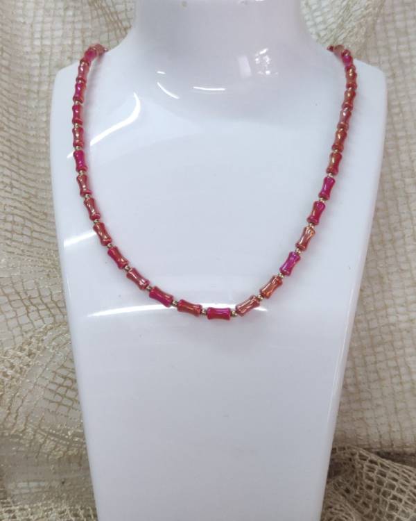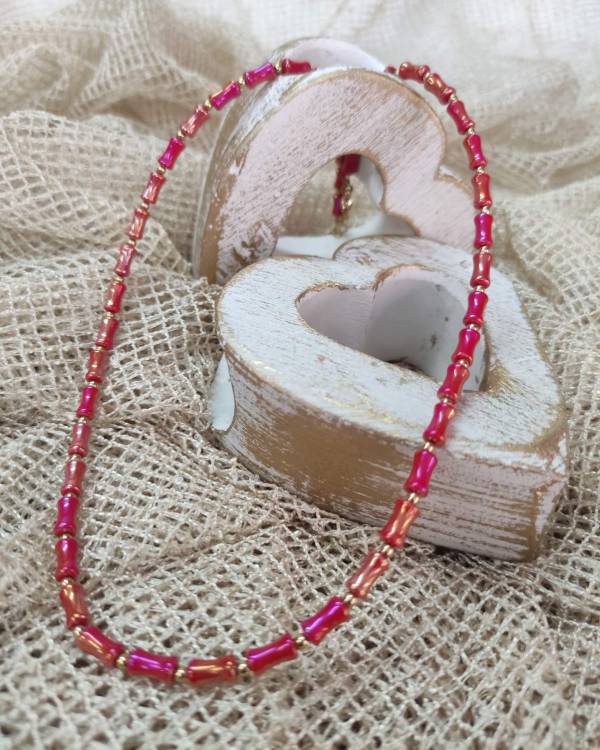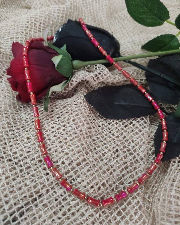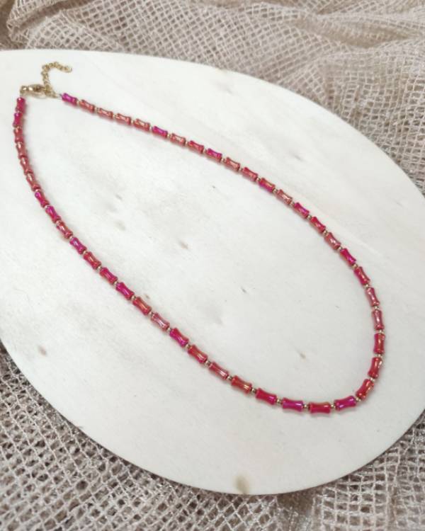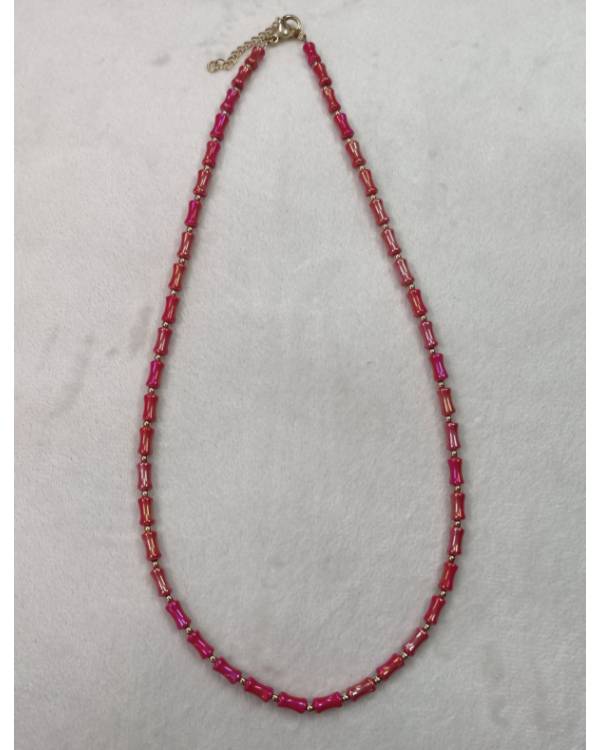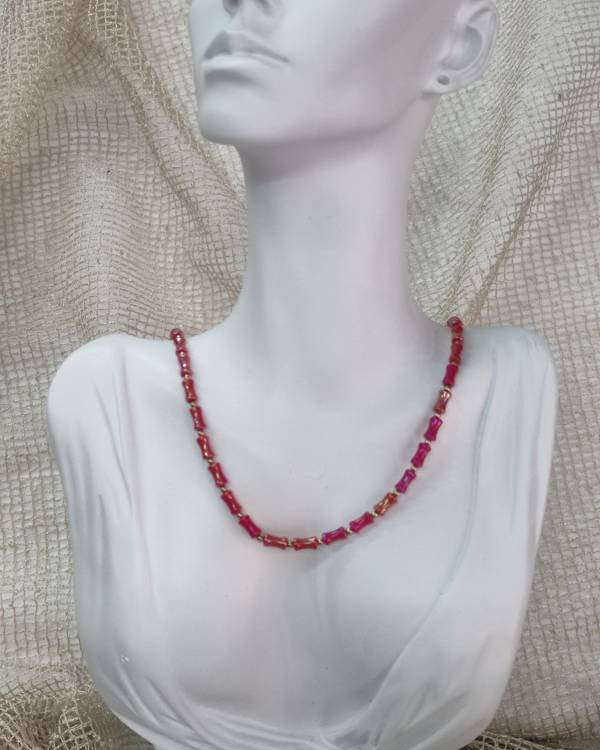 Χειροποίητο κολίε με κρύσταλλα ιριδίζουσα και με χάντρες αιματήτες, περασμένες σε ατσαλόσυρμα και με κούμπωμα ατσάλινο και αλυσιδάκι για αυξομείωση. Η δίασταση του είναι 48 εκ. Θα το παραλάβετε σε συσκευασία δώρου.