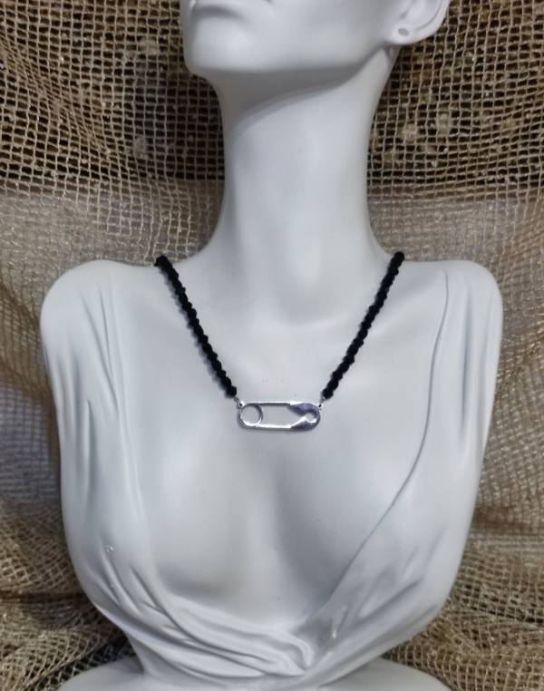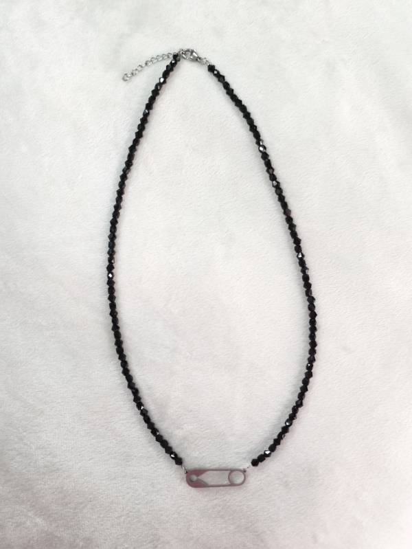 Χειροποίητο κολίε με κρύσταλλα μάυρα και με στοιχείο ατσάλινη παραμάνα, περασμένα σε ατσαλόσυρμα και με αλυσιδάκι για αυξομείωση.