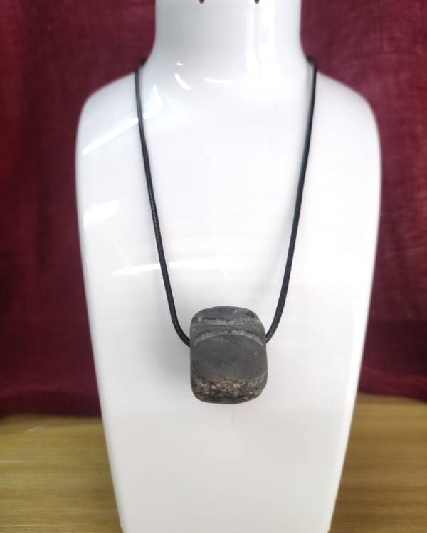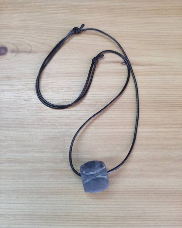 Κολίε με πίλινη γκρί πέτρα κύβος, περασμένη σε κορδόνι δερματίνη μάυρο. Το κορδόνι είναι αυξομειούμενο και φτάνει μέχρι 39 εκ και η καρδία  έχει μάκρος 2 Χ 2 εκ. Θα το παραλάβετε σε συσκευασία δώρου.