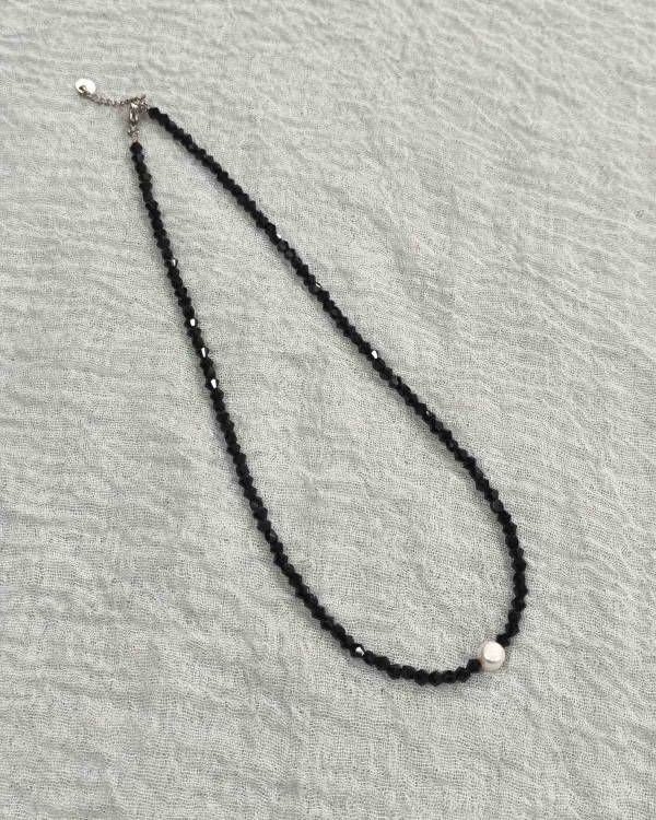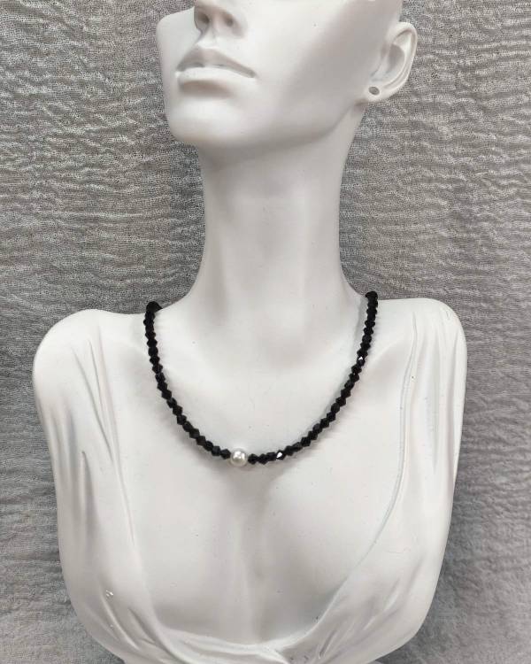 Χειροποιήτο κολίε με μαύρα κρύσταλλα και με ένα μαραριτάρι του γλυκού νερού. Περασμένα σε ατσαλόσυρμα΄διαθέτει και αλυσιδάκι για αυξομείωση. Η δίασταση ρου έιναι 22 εκ. Θα το παραλάβετε σε συσκευασία δώρου.