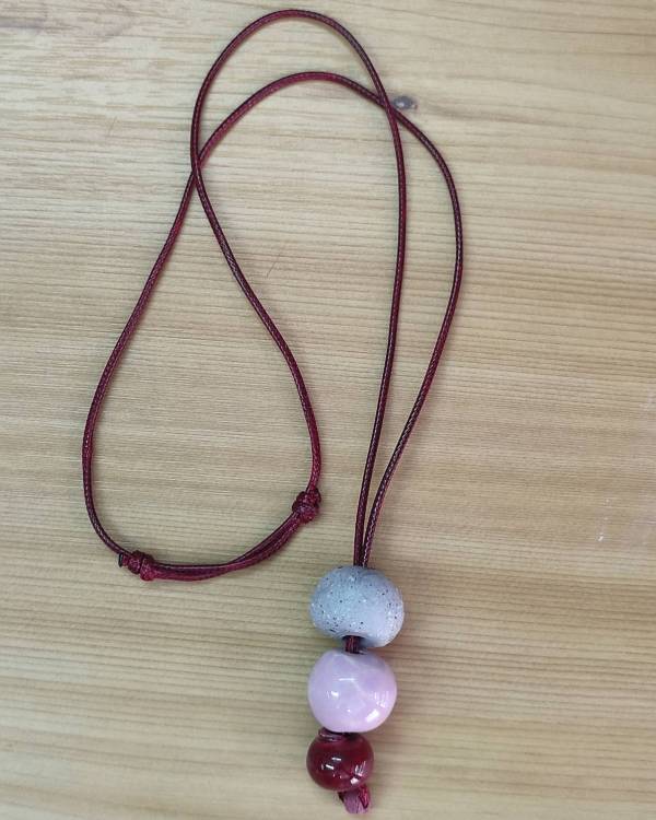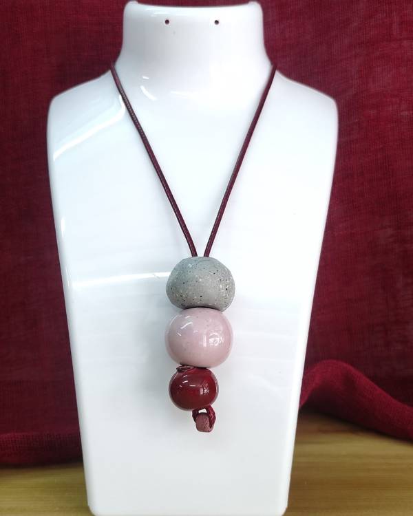Κολίε με πίλινες πέτρες μπορντό, γκρί, ρόζ και μπορντό μικρή, περασμένες σε κορδόνι δερματίνη μπορντό. Το κορδόνι είναι αυξομειούμενο και φτάνει μέχρι 44 εκ και οι πέτρες έχουν μάκρος 5,5 εκ. Θα το παραλάβετε σε συσκευασία δώρου.