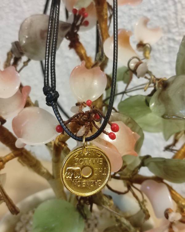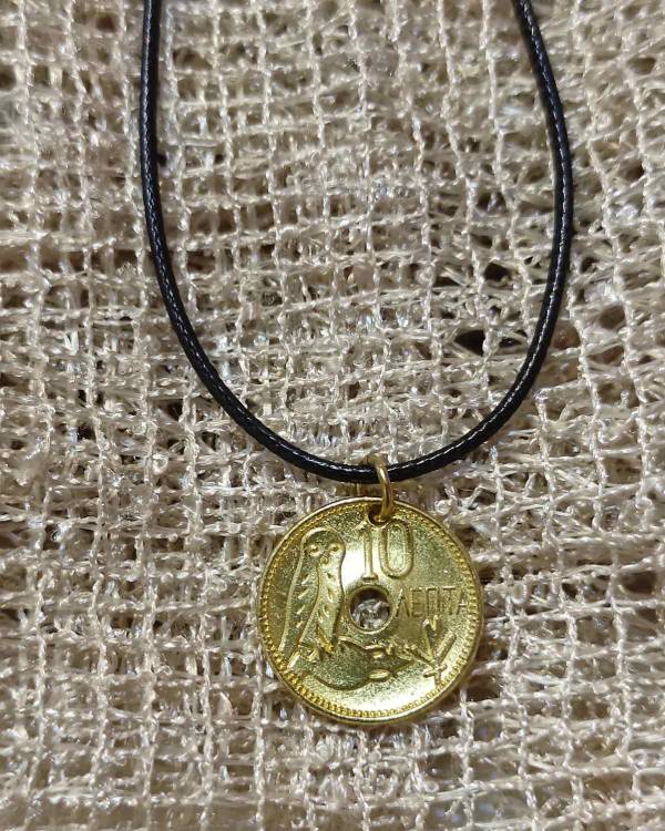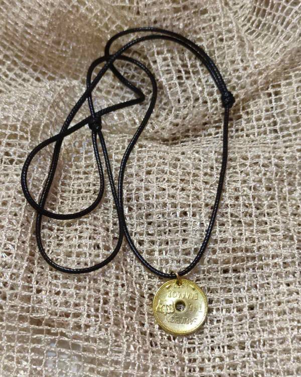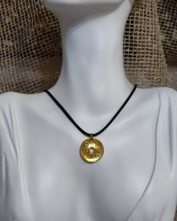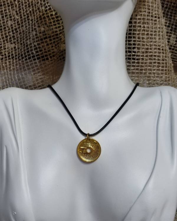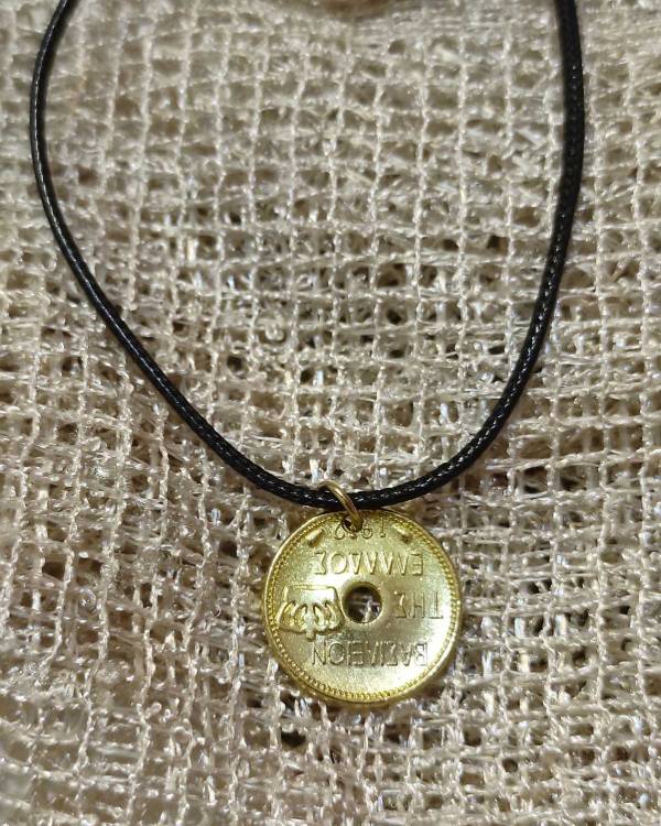Χειροποιήτο κολίε με στοιχείο κέρμα σε χρυσό χρώμα , περασμένο σε κορδόνι μάυρο δερματίνη. Το κορδόνι είναι αυξομειούμενο, το μάκρος του είναι 39 εκ.