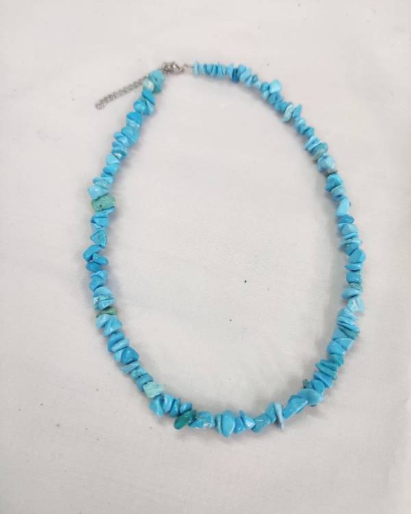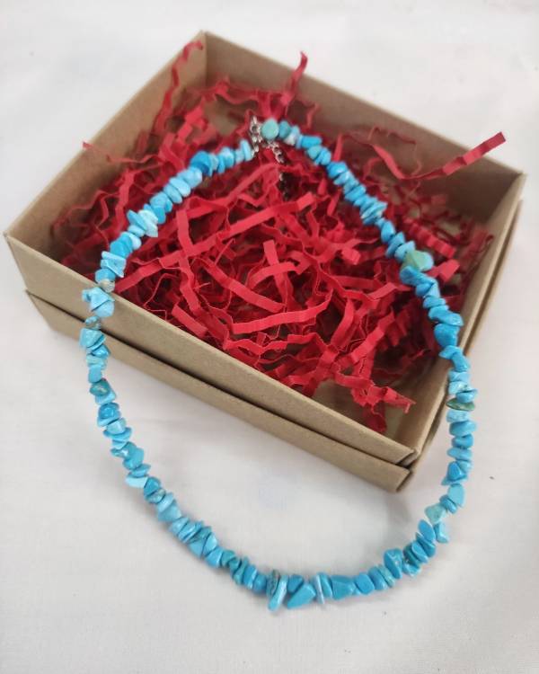 Χειροποίητο κολίε με χάντρες chips τυρκουάζ. Η δίασταση του είναι 42 εκ, διαθέτει αλυσιδάκι αυξομείωσης. Θα το παραλάβετε σε συσκευασία δώρου.