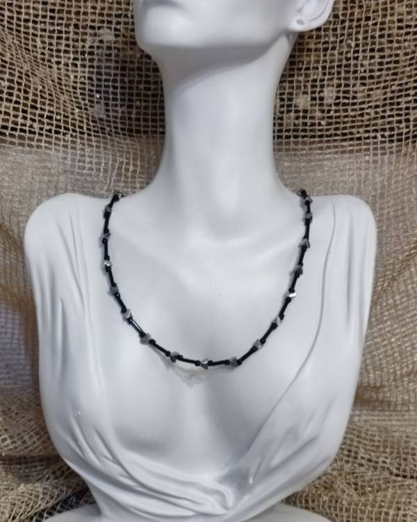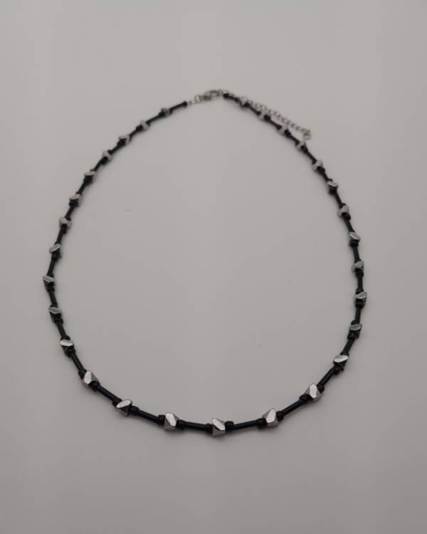 Χειροποιήτο κολίε με χάντρες μάυρες και ασημί σε σύρμα και με αλυσιδάκι για αυξομείωση. Η διασταση είναι 47 εκ.