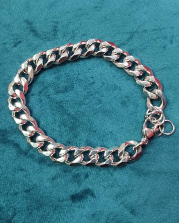 Ατσάλινο βραχίολι φαρδύ ασημί. Η διάσταση του είναι 19 εκ και με το κούμπωμα είναι 22 εκ. Έχει αλυσιδάκι για αυξομείωση.