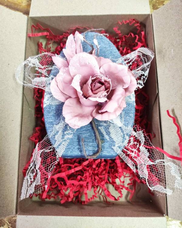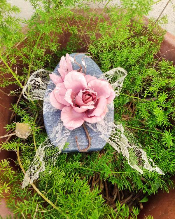 Χειροποίητο κερί αβγό μπλέ, με κορδέλα και  τριαντάφυλλο ρόζ. Η δίασταση του είναι 9 Χ 13 εκ. Σας έρχεται σε συσκευασία δώρου.