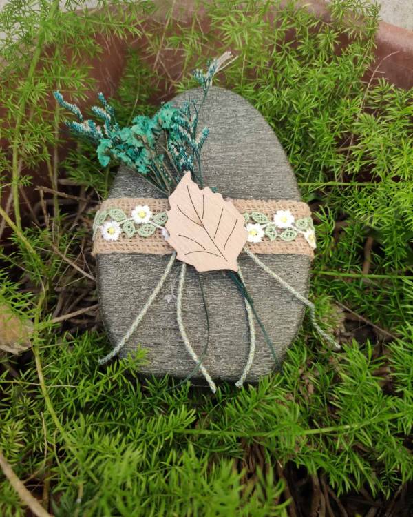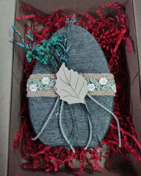 Χειροποίητο κερί αβγό πράσινο, με κορδέλες, αποξυραμένα και φύλλο ξύλινο. Η δίασταση του είναι 9 Χ 13 εκ. Σας έρχεται σε συσκευασία δώρου.