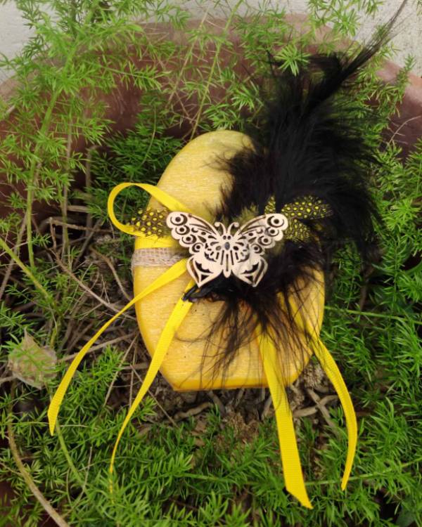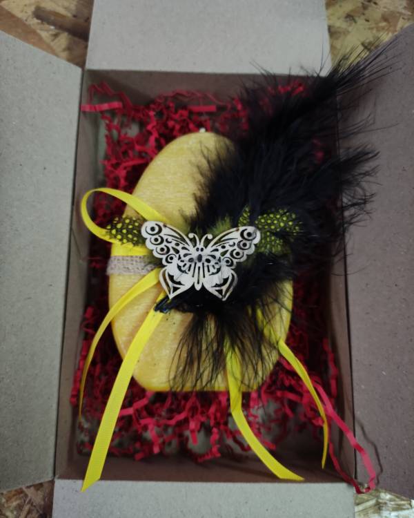 Χειροποίητο κερί αβγό κίτρινο, με κορδέλες, φτερά και υφασμάτινη  πεταλόυδα. Η δίασταση του είναι 9 Χ 13 εκ. Σας έρχεται σε συσκευασία δώρου.