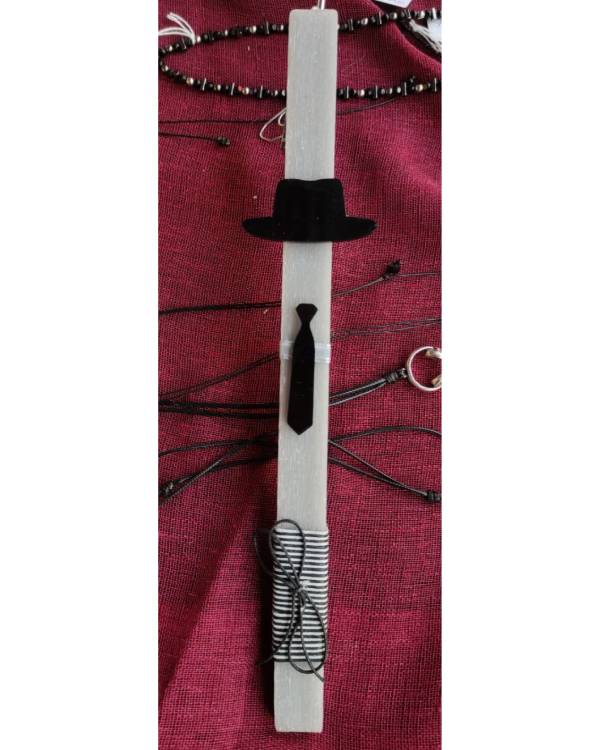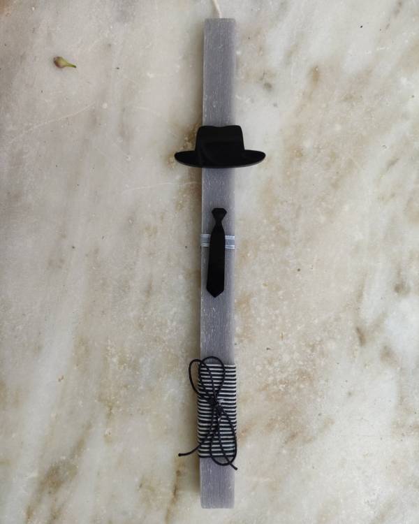 Λαμπάδα πλακέ γκρί, με στοιχείο καπέλο, γραβάτα και φίογκο. Με δίασταση 30 εκ ύψος και φάρδος 2 Χ 1 εκ. Σας  έρχεται με κουτί για λαμπάδα, για να το προσφέρεται στο αγαπημένο σας πρόσωπο.