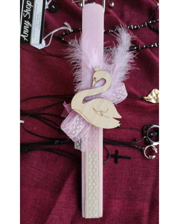 Λαμπάδα πλακέ ρόζ, στοιχείο ξύλινο κύκνο, με φτερά και κορδέλες. Με δίασταση 30 εκ ύψος και φάρδος 3 Χ 1,5 εκ. Σας  έρχεται με κουτί για λαμπάδα, για να το προσφέρεται στο αγαπημένο σας πρόσωπο.
