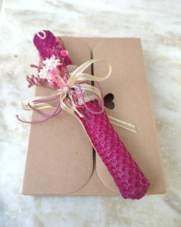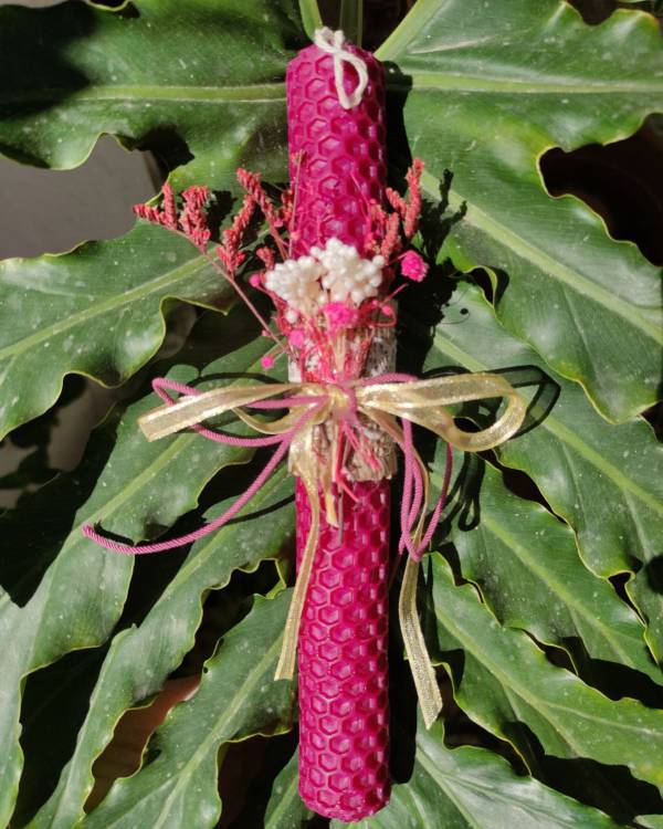 Χειροποίητη Λαμπάδα κυρήθρα φούξια, με αποξυραμένα λουλούδια, με κορδέλες σομόν,χρυσή  και κορδέλα καφέ ανοιχτό. Με δίασταση 22 Χ 2 εκ. Σας έρχεται σε συσκευασία για λαμπάδα.