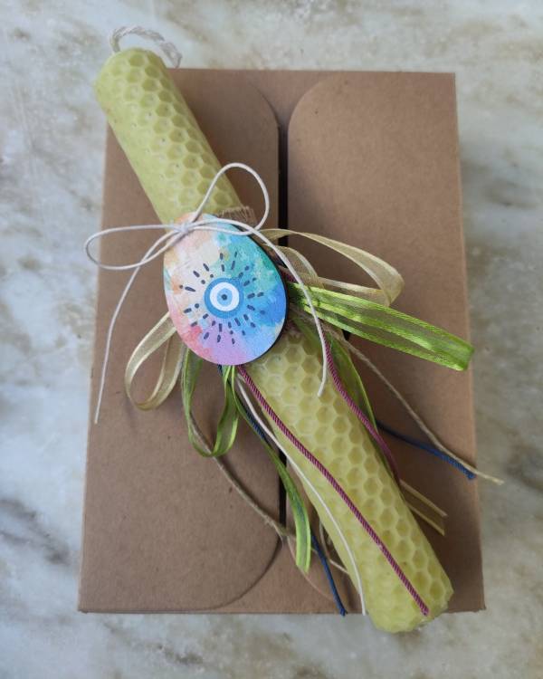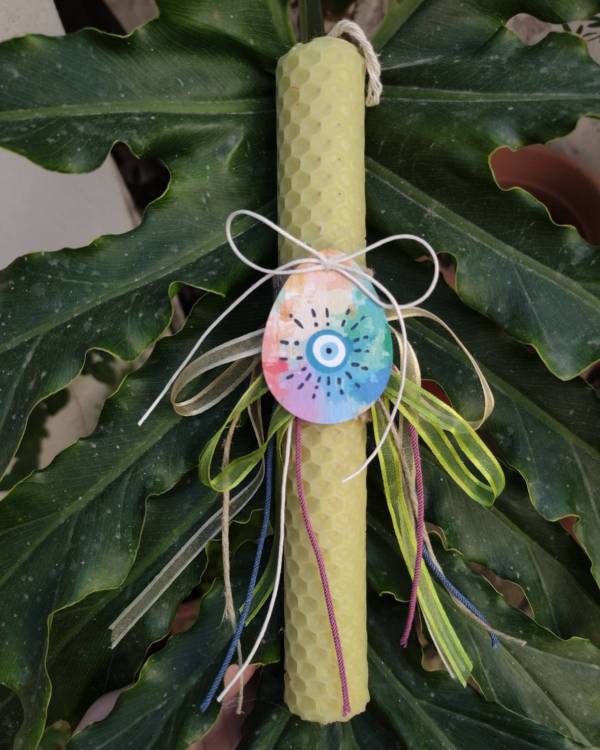 Χειροποίητη Λαμπάδα κυρήθρα κίτρινη, με στοιχείο αβγό ξύλινο πολύχρωμο, με κορδέλες πολύχρωμες και κορδέλα καφέ ανοιχτό. Με δίασταση 22 Χ 2 εκ. Σας έρχεται σε συσκευασία για λαμπάδα.