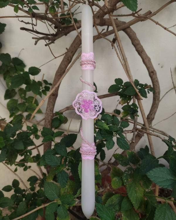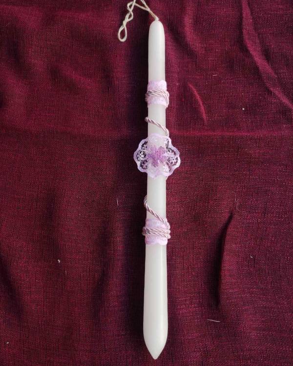 Χειροποιήτη λαμπάδα λευκή με σχοινί ρόζ, δαντέλα ρόζ και λουλουδάκι δαντελένιο με ένα μώβ λουλουδάκι, το ύψος της είναι 30 εκ. Σας έρχεται με σακουλάκι για λαμπάδα.