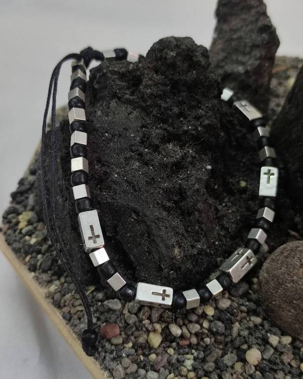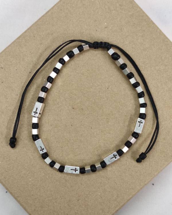 Χειροποίητο βραχίολι ανδρικό με χάντρες με σταυρούς, περασμένες σε κηροκλωστή μάυρη. Η διάσταση του είναι 21 εκ και διαθέτει κούμπωμα αυξομείωσης. Θα το παραλάβετε σε συσκευασία δώρου.
