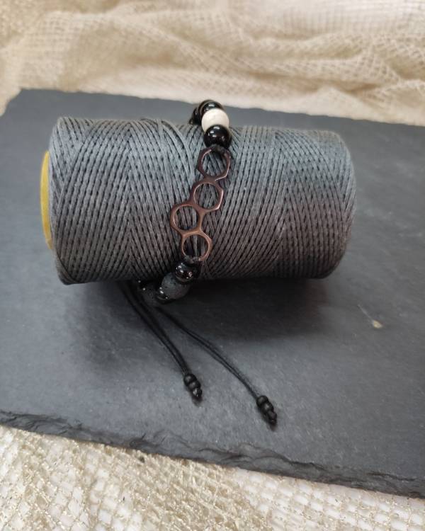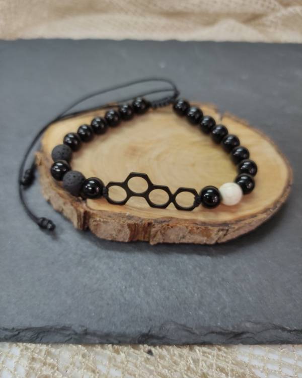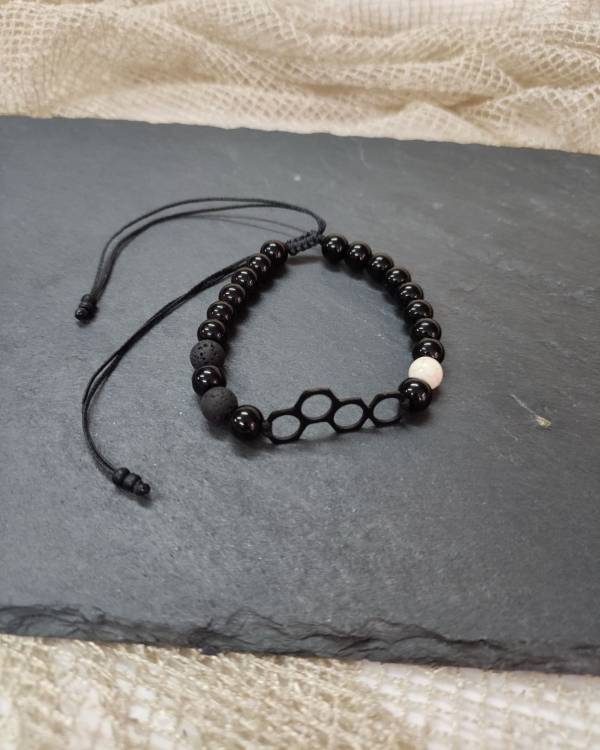 Χειροποιήτο βραχίολι με στοιχείο κηρήθρα και με ημιπολύτιμες πέτρες . Με κούμπωμα αυξομείωσης. Με μάκρος 19 εκ, μαζί με το κούμπωμα είναι 20 εκ.