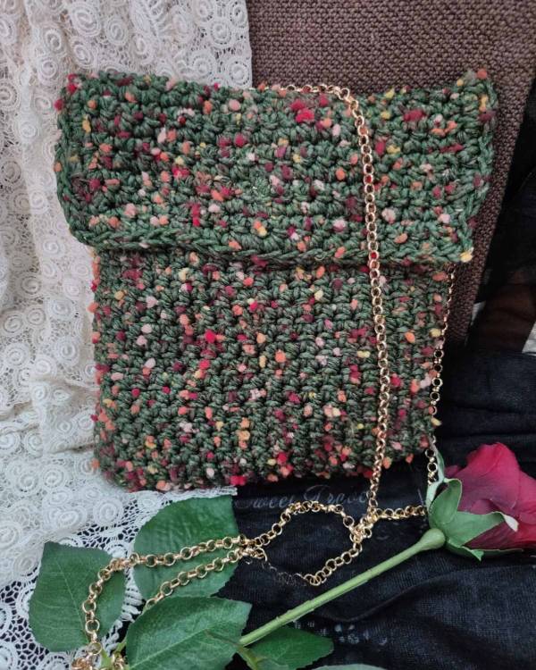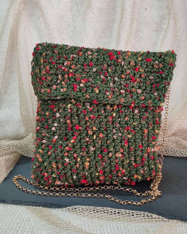Χειροποιήτο τσαντάκι χιαστί με ιδιαίτερο μαλλί σε χρώμα πράσινο και πάνω του έχει δίαφορα χρώματα. Στο καπάκι έχει μαγνητάκι για κλείνει και αλυσίδα για τον ώμο ή για χιαστί. Με ύψος 24 εκ και φάρδος 21 εκ.