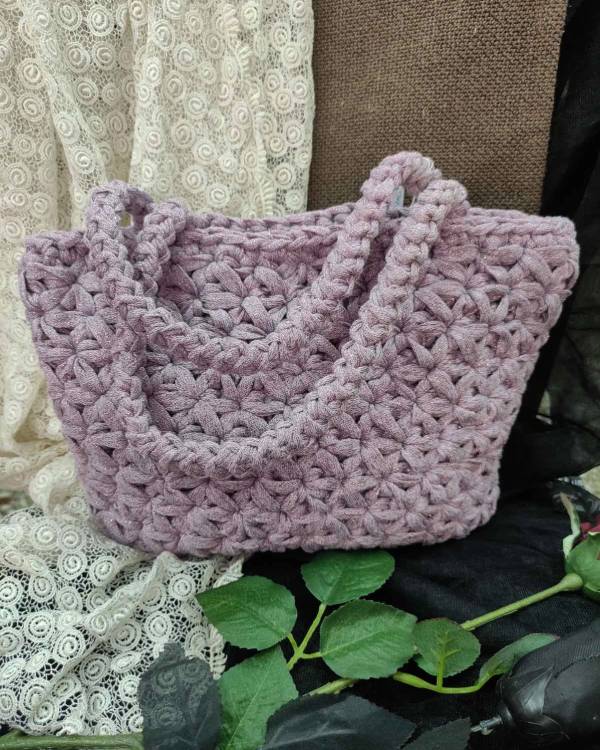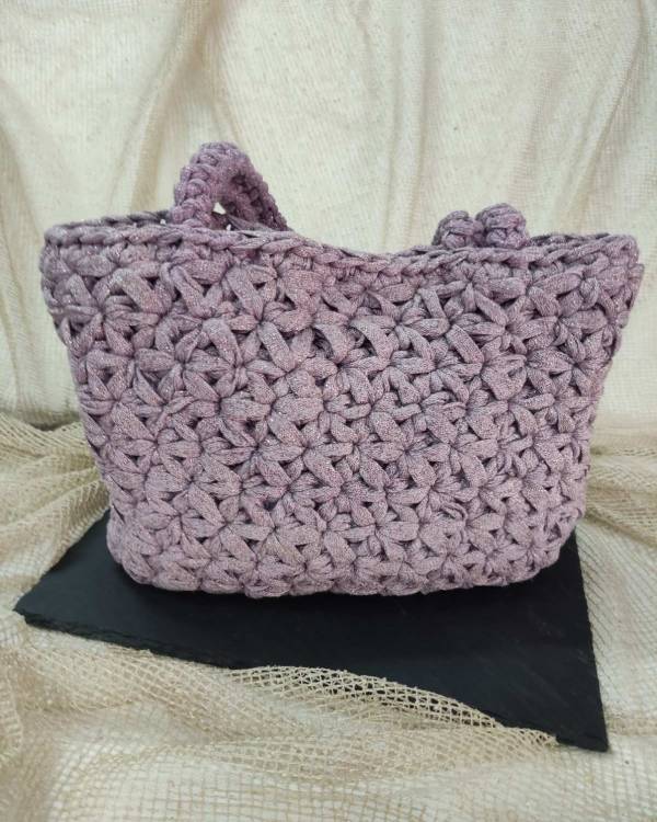 Χειροποίητη τσάντα πλεκτή σχέδίο αστεράκι σε μώβ κορδόνι με μεταλιζέ μώβ κλωστή. Το μακρος της είναι 21 εκ , το φάρδος της είναι 32 εκ και ο πάτος είναι 9 εκ. Με μαγνητάκι για να κλείνει.