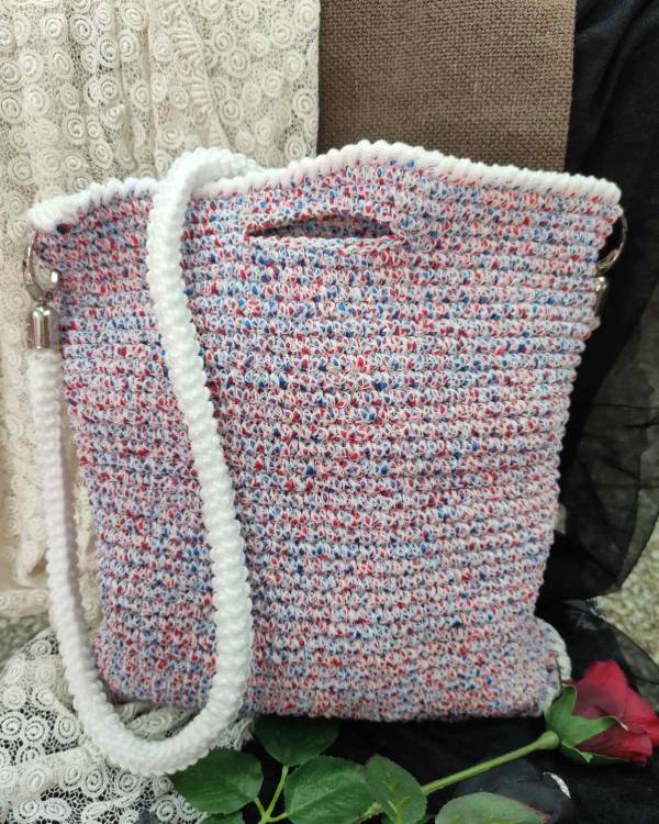 Μεγάλη χειροποίητη τσάντα για καθημερίνη χρήση , πολύχρωμη και το λουρί της είναι πλεγμένο στο χέρι απο λευκό νήμα. Με ύψος 34 εκ και φάρδος 35 εκ.