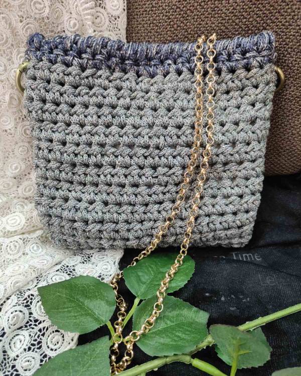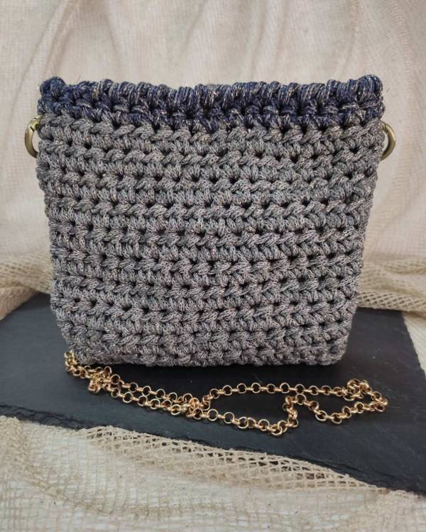 Χειροποίητο τσαντακι σε γκρί χρυσό με λεπτομέρεια μπλέ χρυσό. Έχει μαγνητάκι για κλείσιμο και αλυσιδα. Το ύψος του είναι 18 εκ και το φάρδος του είναι 19 εκ .
