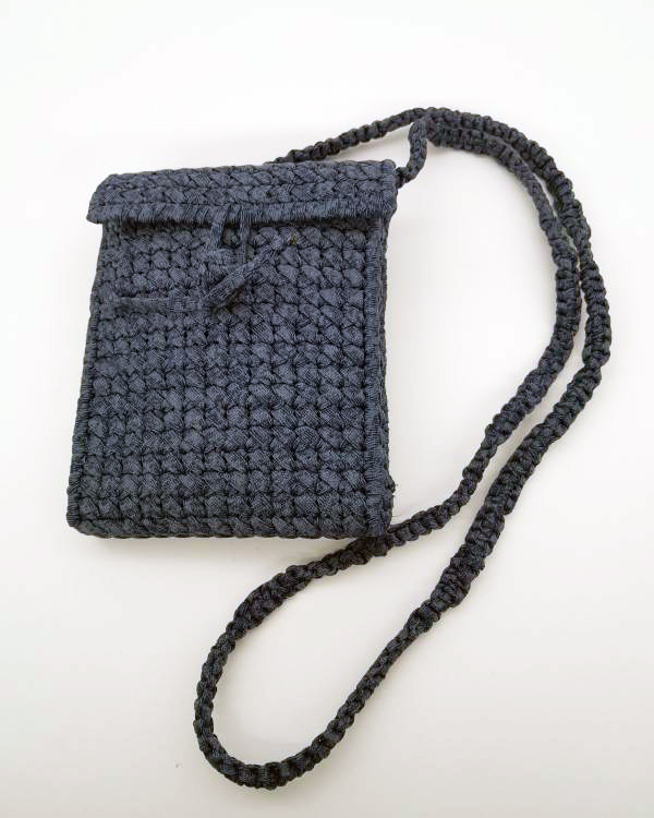 Χειροποιήτο τσαντάκι πλεκτό πανω σε πλέγμα σε μπλέ χρώμα και με κορδόνι απο το ίδιο μαλλί. Με φάρδος 16 εκ και ύψος 21 εκ .